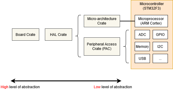 Крейт уровня абстракции аппаратного обеспечения (Hardware Abstraction Layer) предоставляет удобный для разработчика интерфейс к функциям и периферийным устройствам микроконтроллера. Обычно он реализуется поверх крейта Peripheral Access Crate (PAC).